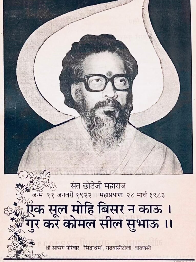 Sant Chhote Ji Maharaj (1922–1983) was a revered Vedic scholar, astrologer, musician, and spiritual master from sidhaashram, Kashi. A born prodigy, he spent his early years under the divine guidance of his grandfather, Guru Shri Narayan Ji Maharaj, mastering the Yajurveda and performing complex Agnihotra Yajnas. His deep connection with Ram Naam Sankirtan began in childhood and blossomed into a lifelong devotion.